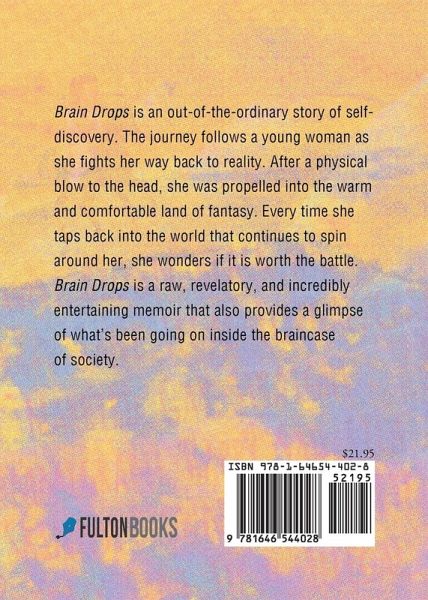 Brain Drops is an out-of-the-ordinary story of self-discovery. The journey follows a young woman as she fights her way back to reality. After a physical blow to the head, she was propelled into the warm and comfortable land of fantasy. Every time she taps back into the world that continues to spin around her, she wonders if it is worth the battle. Brain Drops is a raw, revelatory, and incredibly entertaining memoir that also provides a glimpse of what's been going on inside the braincase of society.