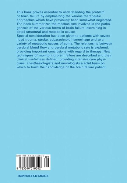 This book proves essential to understanding the problem of brain failure by emphasizing the various therapeutic approaches which have previously been somewhat neglected. The book summarizes the mechanisms involved in the pathogenesis of the various forms of brain failure, examining in detail structural and examining metabolic causes. Special consideration has been given to patients with severe head trauma, stroke, subarachnoid haemorrhage and to a variety of metabolic causes of coma. The relationship between cerebral blood flow and cerebral metabolic rate is explored, providing important conclusions with regard to therapy. New techniques of monitoring brain failure are described and their clinical usefulness defined, providing intensive care physicians, anaesthesiologists and neurologists a solid basis on which to build their knowledge of the brain-failure patient.