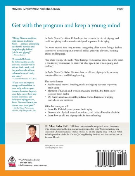 Exercises designed to prevent brain aging. Dr. Aihan Kuhn shares her expertise in tai chi, qigong, and Traditional Chinese Medicine, giving readers exercises designed to prevent brain aging. This book represents a synthesis of Dr. Kuhn’s studies in martial arts as well as Eastern and Western healing. Tai chi and qigong practitioners around the world have long known that these arts promote fitness and self-defense. In this book Dr. Kuhn explores their physical, mental, emotional, and spiritual benefits, emphasizing how tai chi and qigong aid in memory, emotional balance, and lifelong learning. This book features: * An illustrated manual detailing tai chi and qigong exercises to prevent brain aging * Elements of Eastern and Western medicine combined to form a new vision of brain health * Dr. Kuhn’s concise, accessible guidance from a lifetime of studying martial arts and medicine With this book you will: * Learn Dr. Kuhn’s keys to prevent brain aging * Discover the physical, mental, emotional, and spiritual benefits of tai chi * Learn how tai chi and qigong assist in human healing Dr. Kuhn says we have long assumed that getting older means facing a decline in memory, attention span, numerical ability, creativity, alertness, learning ability, and language. "But we were wrong,” she adds. “ New findings from science show that if the brain can be consistently stimulated, no matter our age, the brain can remain youthful and healthy.”