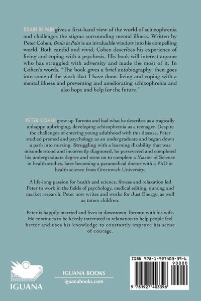 Brain in Pain gives a first-hand view of the world of schizophrenia and challenges the stigma surrounding mental illness. Written by Peter Cohen, Brain in Pain is an invaluable window into his compelling world. Both candid and vivid, Cohen describes his experience of living and coping with a psychosis. His book will interest anyone who has struggled with adversity and made the most of it. In Cohen's words, "The book gives a brief autobiography, then goes into some of the work that I have done, living and coping with a mental illness and preventing and ameliorating schizophrenia and also hope and help for the future."