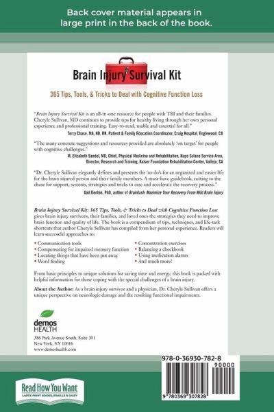 Brain Injury Survival Kit: 365 Tips, Tools, & Tricks to Deal with Cognitive Function Loss gives brain injury survivors, their families, and loved ones the strategies they need to improve brain function and quality of life. The book is a compendium of tips, techniques, and life-task shortcuts that author Cheryle Sullivan has compiled from her personal experience. Readers will learn successful approaches to: Communication tools; Compensating for impaired memory function; Locating things that have been put away; Word fnding; Concentration exercises; Balancing a checkbook; Using medication alarms; And much more! From basic principles to unique solutions for saving time and energy, this book is packed with helpful information for those coping with the special challenges of a brain injury.
