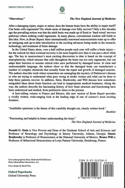 Here is a book that anyone interested in how the brain works will find fascinating and enjoyable. Written in a highly readable style, the book looks at how the damaged brain can be repaired and reconstructed. The key to neuroscience's most exciting discoveries to date is the theory that is rapidly gaining adherents in the scientific community - the theory of neuroplasticity. Neuroplasticity stresses that cells throughout the brain can not only regenerate, but can adapt their function to assume critical roles once performed by damaged tissue. The author explains how the brain manufactures complex chemicals that foster growth in damaged brain cells, and how misguided ideas can adversely affect how physicians treat patients. A best-selling volume in France and Spain, Brain Repair provides a vividly written, wide-ranging look at the leading edge of one of science's most exciting frontiers.