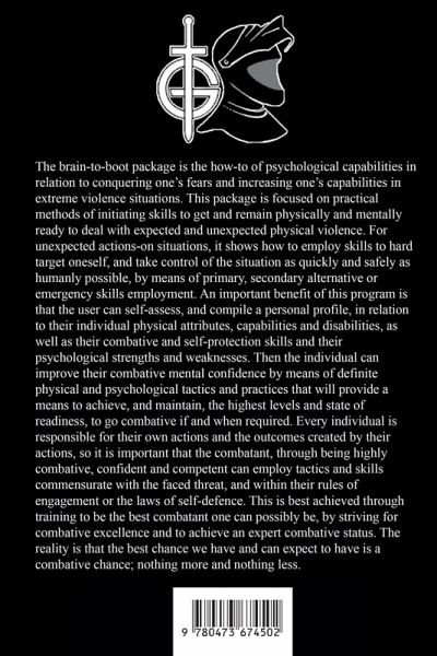 The brain-to-boot package is the how-to of psychological capabilities in relation to conquering one's fears and increasing one's capabilities in extreme violence situations. This package is focused on practical methods of initiating skills to get and remain physically and mentally ready to deal with expected and unexpected actions-on situations, it shows how to employ skills to hard target oneself, and take control of the situation as quickly and safely as humanly possible, by means of primary, secondary alternative emergency skills employment. An important benefit of this program is that the user can self-assess and compile a personal profile in relation to their individual physical attributes, capabilities and disabilities, as well as their combative and self-protection skills and their psychological strengths and weaknesses. Then the individual can improve their combative mental confidence by means of definite physical and psychological tactics and practices that will provide a means to achieve, and maintain, the highest levels and state of readiness to go combative if and when required. Every individual is responsible for their own actions and the outcomes created by their actions, so it is important that the combatant, through being highly combative, confident and competent can employ tactics and skills commensurate with the faced threat, and within their rules of engagement or the laws of self-defence. This is best achieved through training to be the best combatant one can possibly be, by striving for combative excellence and to achieve an expert combative status. The reality is that the best chance we have and can expect to have is a combative chance, nothing more and nothing less.