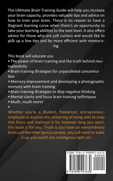 The Ultimate Brain Training Guide will help you increase your brain capacity, provides valuable tips and advice on how to train your brain. There is no reason to have a stagnant learning curve when there's an opportunity to take your learning abilities to the next level. It also offers advice for those who are just curious and would like to pick up a few tips and be more efficient with memorizing. This book will educate youThe power of brain training and the truth behind neuroplasticity Brain training strategies for unparalleled concentration Memory improvement and developing a photographic memory with brain training Brain training strategies to stop negative thinking Mental clarity and focus brain training techniques Much, much more! Whether you're a student, freelancer, entrepreneur, employee or anyone else dreaming of being able to snap into focus and maintain it for however long you want, this book is for you. Truth is you have an extraordinary brain just like other genius people, you just need to wake it up and switch the intelligence light on!