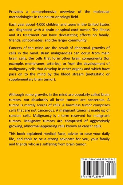 Provides a comprehensive overview of the molecular methodologies in the neuro-oncology field. Each year about 4,000 children and teens in the United States are diagnosed with a brain or spinal cord tumor. The illness and its treatment can have devastating effects on family, friends, schoolmates, and the larger community. Cancers of the mind are the result of abnormal growths of cells in the mind. Brain malignancies can occur from main brain cells, the cells that form other brain components (for example, membranes, arteries), or from the development of malignancy cells that develop in other organs and which have pass on to the mind by the blood stream (metastatic or supplementary brain tumor). Although some growths in the mind are popularly called brain tumors, not absolutely all brain tumors are cancerous. A tumor is merely scores of cells. A harmless tumor comprises cells that are not cancerous. A malignant tumor is made up of cancers cells. Malignancy is a term reserved for malignant tumors. Malignant tumors are comprised of aggressively growing, abnormal-appearing cells known as cancer cells.This book explained medical facts, advice to ease your daily life, and tools to be a strong advocate for you, your family and friends who are suffering from brain tumor....