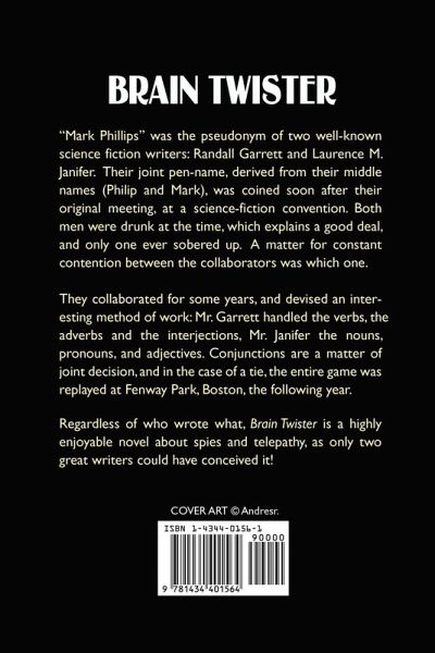 "Mark Phillips" was the pseudonym of two well-known science fiction writers: Randall Garrett and Laurence M. Janifer. Their joint pen-name, derived from their middle names (Philip and Mark), was coined soon after their original meeting, at a science-fiction convention. Both men were drunk at the time, which explains a good deal, and only one ever sobered up. A matter for constant contention between the collaborators was which one. They collaborated for some years, and devised an interesting method of work: Mr. Garrett handled the verbs, the adverbs and the interjections, Mr. Janifer the nouns, pronouns, and adjectives. Conjunctions are a matter of joint decision, and in the case of a tie, the entire game was replayed at Fenway Park, Boston, the following year. Regardless of who wrote what, Brain Twister is a highly enjoyable novel about spies and telepathy, as only two great writers could have conceived it!