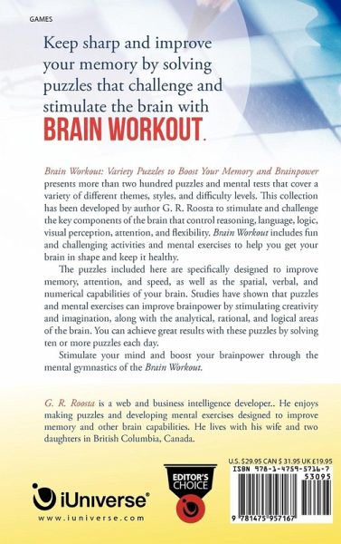 Brain Workout: Variety Puzzles to Boost Your Memory and Brainpower presents more than two hundred puzzles and mental tests that cover a variety of different themes, styles, and difficulty levels. This collection has been developed by author G. R. Roosta to stimulate and challenge the key components of the brain that control reasoning, language, logic, visual perception, attention, and flexibility. Brain Workout includes fun and challenging activities and mental exercises to help you get your brain in shape and keep it healthy. The puzzles included here are specifically designed to improve memory, attention, and speed, as well as the spatial, verbal, and numerical capabilities of your brain. Studies have shown that puzzles and mental exercises can improve brainpower by stimulating creativity and imagination, along with the analytical, rational, and logical areas of the brain. You can achieve great results with these puzzles by solving ten or more puzzles each day. Stimulate your mind and boost your brainpower through the mental gymnastics of the Brain Workout.