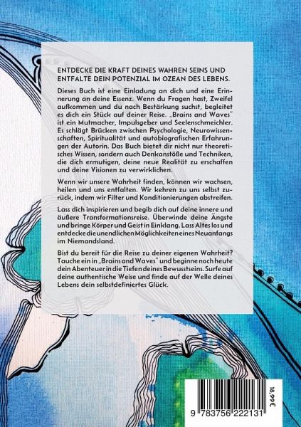 Brains and Waves Entdecke die Kraft deines wahren Seins und entfalte dein Potenzial im Ozean des Lebens. Dieses Buch ist eine Einladung an dich und eine Erinnerung an deine Essenz. Wenn du Fragen hast, Zweifel aufkommen und du nach Bestärkung suchst, begleitet es dich ein Stück auf deiner Reise. "Brains and Waves" ist ein Mutmacher, Impulsgeber und Seelenschmeichler. Es schlägt Brücken zwischen Psychologie, Neurowissenschaften, Spiritualität und autobiografischen Erfahrungen der Autorin. Das Buch bietet dir nicht nur theoretisches Wissen, sondern auch Denkanstöße und Techniken, die dich ermutigen, deine neue Realität zu erschaffen und deine Visionen zu verwirklichen. Wenn wir unsere Wahrheit finden, können wir wachsen, heilen und uns entfalten. Wir kehren zu uns selbst zurück, indem wir Filter und Konditionierungen abstreifen. Lass dich inspirieren und begib dich auf deine innere und äußere Transformationsreise. Überwinde deine Ängste und bringe Körper und Geist in Einklang. Lass Altes los und entdecke die unendlichen Möglichkeiten eines Neuanfangs im Niemandsland. Bist du bereit für die Reise zu deiner eigenen Wahrheit? Tauche ein in "Brains and Waves" und beginne noch heute dein Abenteuer in die Tiefen deines Bewusstseins. Surfe auf deine authentische Weise und finde auf der Welle deines Lebens dein selbstdefiniertes Glück.