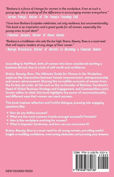 According to NatWest, 60% of women who have considered starting a business did not; due to a lack of self-worth and confidence. Brains, Beauty, Boss: The Ultimate Guide for Women in the Workplace explores the intersection between female empowerment, entrepreneurship and career advancement. Sharing the incredible accounts of women from the Forbes 30 under 30 list such as the co-founder of Betches, Facebook's Head of Global Business Strategy and Engagement, and Cosmopolitan.com's former editor-in-chief, this book highlights the power of unconventionality, and different ways that women can reach success. This book inspires reflection and fruitful dialogue, pressing into engaging questions like:How do you define success? What are the most common trends amongst successful females? How is the workplace evolving for women? What is Impostor Syndrome, and how can you overcome it? Brains, Beauty, Boss is a must-read for all young women, providing useful insight on building confidence, overcoming obstacles, and pursuing your dreams.