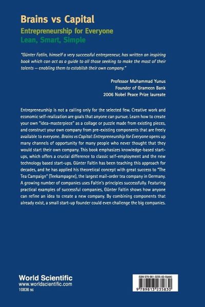 Entrepreneurship is not a calling only for the selected few. Creative work and economic self-realization are goals that anyone can pursue. Learn how to create your own "idea-masterpiece" as a collage or puzzle made from existing pieces, and construct your own company from pre-existing components that are freely available to everyone. Brains versus Capital: Entrepreneurship for Everyone opens up many channels of opportunity for many people who never thought that they would start their own company. This book emphasizes knowledge-based start-ups, which offers a crucial difference to classic self-employment and the new technology based start-ups. Günter Faltin has been teaching this approach for decades, and he has applied his theoretical concept with great success to "The Tea Campaign" (Teekampagne), the largest mail-order tea company in Germany. A growing number of companies uses Professor Faltin's principles successfully. Featuring practical examples of successful companies, Günter Faltin shows how anyone can refine an idea to create a new company. By combining components that already exist, a small start-up founder could even challenge the big companies.