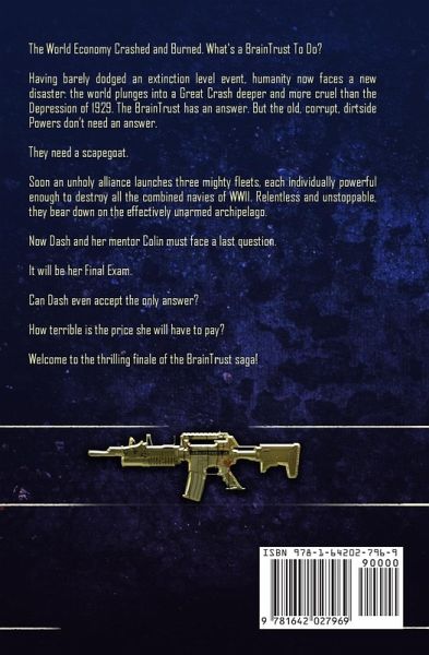 The World Economy Crashed and Burned. What's a BrainTrust To Do? Having barely dodged an extinction level event, humanity now faces a new disaster: the world plunges into a Great Crash deeper and more cruel than the Depression of 1929. The BrainTrust has an answer. But the old, corrupt, dirtside Powers don't need an answer. They need a scapegoat. Soon an unholy alliance launches three mighty fleets, each individually powerful enough to destroy all the combined navies of WWII. Relentless and unstoppable, they bear down on the effectively unarmed archipelago. Now Dash and her mentor Colin must face a last question. It will be her Final Exam. Can Dash even accept the only answer? How terrible is the price she will have to pay? Welcome to the thrilling finale of the BrainTrust saga! ---- Note: For this novel, in collaboration with five economists and two cryptocurrency software engineers, I developed a new currency that should work in real life to flatten the boom/bust cycle. So if you'd like to see one way an advanced civilization could deal with economics, you could read this not only as a good yarn but as a guide.