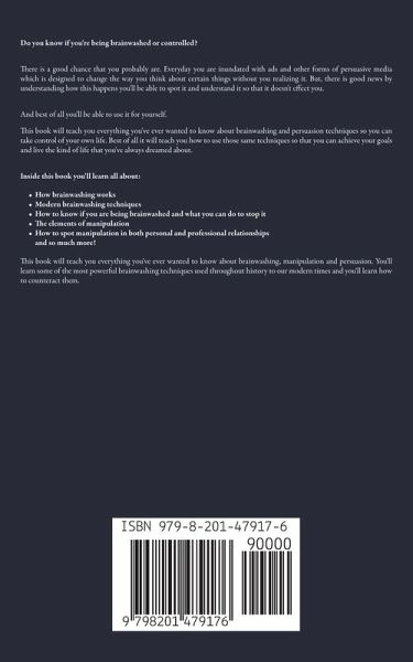 Do you know if you're being brainwashed or controlled? There is a good chance that you probably are. Everyday you are inundated with ads and other forms of persuasive media which is designed to change the way you think about certain things without you realizing it. But, there is good news by understanding how this happens you'll be able to spot it and understand it so that it doesn't effect you. And best of all you'll be able to use it for yourself. This book will teach you everything you've ever wanted to know about brainwashing and persuasion techniques so you can take control of your own life. Best of all it will teach you how to use those same techniques so that you can achieve your goals and live the kind of life that you've always dreamed about. Inside this book you'll learn all about:How brainwashing works Modern brainwashing techniques How to know if you are being brainwashed and what you can do to stop it The elements of manipulation How to spot manipulation in both personal and professional relationships and so much more! This book will teach you everything you've ever wanted to know about brainwashing, manipulation and persuasion. You'll learn some of the most powerful brainwashing techniques used throughout history to our modern times and you'll learn how to counteract them.