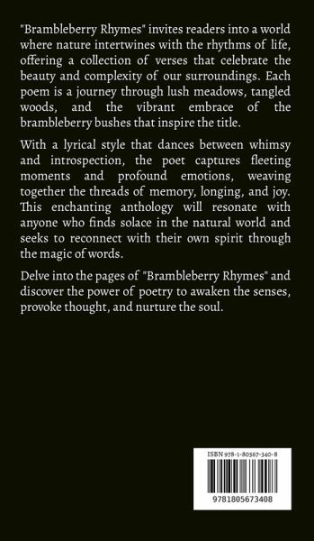 "Brambleberry Rhymes" invites readers into a world where nature intertwines with the rhythms of life, offering a collection of verses that celebrate the beauty and complexity of our surroundings. Each poem is a journey through lush meadows, tangled woods, and the vibrant embrace of the brambleberry bushes that inspire the title. With a lyrical style that dances between whimsy and introspection, the poet captures fleeting moments and profound emotions, weaving together the threads of memory, longing, and joy. This enchanting anthology will resonate with anyone who finds solace in the natural world and seeks to reconnect with their own spirit through the magic of words. Delve into the pages of "Brambleberry Rhymes" and discover the power of poetry to awaken the senses, provoke thought, and nurture the soul.