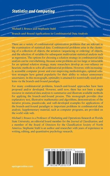 From the reviews: "To say it unadorned at the outset, this excellent mongraph by Brusco and Stahl on applications of branch-and-bound algorithms in combinatorial data anlaysis fills a long neglected gap in the quantitative psychology literature, and will prove an indispensable companion to any researcher having serious interest in advanced techniques for seriation/scaling and nonhierarchical clustering." Psychometrika "This monograph is true to its purpose: developing and carefully explaining the application of branch-and-bound (B&B) algorithms for the solution of specific combinatorial optimization problems in statistics. ... One of the bright features of this book is the even handed way in which the B&B methods are presented. In each case, the authors clearly spell out not only the process but also its strengths and limitations. ... Brusco and Stahl do a nice job ... ." (Jon R. Kettenring, SIAM Review, Vol. 48 (2), 2006) "This book both summarizes and illustrates the methods that are currently available for applying branch-and-bound methods to certain data analysis situations. ... The mathematical basis is clearly explained, pseudo-code for the algorithms is given where needed, very simple cases are used to demonstrate the methodology, and larger examples are also presented. ... Care is taken to discuss the limitations as well as the advantages of the branch-and-bound approach." (C.D. Kemp, Short Book Reviews, Vol. 26 (1), 2006) "This book ... is the first attempt to use this technique, branch and bound, to solve discrete optimization problems that arise in statistical data analysis. The authors are one of the pioneers in this area and authored a series of papers in relevant leading journals. This book is ... written in a more lucid language, and includes a good number of examples, illustrations and case studies. ... This book is going to be extremely useful to the researchers or practitioners of combinatorial data analysis." (Bimal Roy, Sankhya: The Indian Journal of Statistics, Vol. 68 (1), 2006) "It is the aim of this monograph to summarise and illustrate available methods for applying the branch-and-bound process to problems of combinatorial data analysis. ... The book is well suited to all students and researchers interested in the implementation of branch-and-bound procedures for the statistical analysis of data." (Christina Diakaki, Zentralblatt MATH, Vol. 1093 (19), 2006) "The aim of this book is to build a bridge between operations research (discrete optimization) and statistics. ... Overall, the book is well structured and easily readable and a good introduction to the field of Branch and Bound algorithms as a possible solution to selected problems in statistics." (Gero Szepannek, Statistical Papers, Vol. 48, 2007) "Michael Brusco and Stephanie Stahl suggest solving combinatorial data analysis problems by using the branch-and-bound technique to optimize the objective functions that measure goodness of grouping or sequencing. ... Brusco and Stahl's book is valuable for students and researchers interested in optimization or data analysis. ... They provide mathematical descriptions of objective functions and bounds, pseudocodes, step-by-step illustrations, software programs, and their results for several problems." (Julius Zilinskas, Interfaces, Vol. 37 (1), 2007)