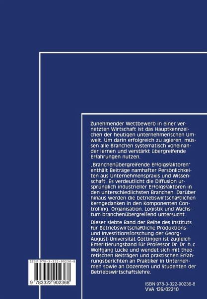 Zunehmender Wettbewerb in einer vernetzten Wirtschaft ist das Hauptkennzeichen der heutigen unternehmerischen Umwelt. Um darin erfolgreich zu agieren, müssen alle Branchen systematisch voneinander lernen und verstärkt übergreifende Erfahrungen nutzen. "Branchenübergreifende Erfolgsfaktoren" enthält Beiträge namhafter Persönlichkeiten aus Unternehmenspraxis und Wissenschaft. Es verdeutlicht die Diffusion ursprünglich industrieller Erfolgsfaktoren in den unterschiedlichsten Branchen. Darüber hinaus werden die betriebswirtschaftlichen Kerngedanken in den Komponenten Controlling, Organisation, Logistik und Wachstum branchenübergreifend untersucht. Verzeichnis: Das Buch enthält Beiträge namhafter Persönlichkeiten aus Unternehmenspraxis und Wissenschaft. Es verdeutlicht die Diffusion ursprünglich industrieller Erfolgsfaktoren in den unterschiedlichsten Branchen.