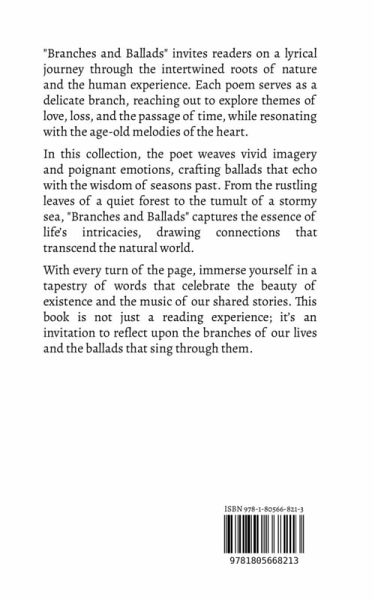 "Branches and Ballads" invites readers on a lyrical journey through the intertwined roots of nature and the human experience. Each poem serves as a delicate branch, reaching out to explore themes of love, loss, and the passage of time, while resonating with the age-old melodies of the heart. In this collection, the poet weaves vivid imagery and poignant emotions, crafting ballads that echo with the wisdom of seasons past. From the rustling leaves of a quiet forest to the tumult of a stormy sea, "Branches and Ballads" captures the essence of life's intricacies, drawing connections that transcend the natural world. With every turn of the page, immerse yourself in a tapestry of words that celebrate the beauty of existence and the music of our shared stories. This book is not just a reading experience; it's an invitation to reflect upon the branches of our lives and the ballads that sing through them.