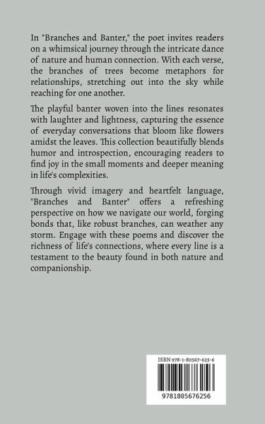 In "Branches and Banter," the poet invites readers on a whimsical journey through the intricate dance of nature and human connection. With each verse, the branches of trees become metaphors for relationships, stretching out into the sky while reaching for one another. The playful banter woven into the lines resonates with laughter and lightness, capturing the essence of everyday conversations that bloom like flowers amidst the leaves. This collection beautifully blends humor and introspection, encouraging readers to find joy in the small moments and deeper meaning in life's complexities. Through vivid imagery and heartfelt language, "Branches and Banter" offers a refreshing perspective on how we navigate our world, forging bonds that, like robust branches, can weather any storm. Engage with these poems and discover the richness of life's connections, where every line is a testament to the beauty found in both nature and companionship.