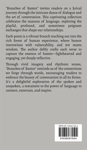 "Branches of Banter" invites readers on a lyrical journey through the intricate dance of dialogue and the art of conversation. This captivating collection celebrates the nuances of language, exploring the playful, profound, and sometimes poignant exchanges that shape our relationships. Each poem is a vibrant branch reaching out into the rich forest of human experience, where humor intertwines with vulnerability, and wit meets wisdom. The author deftly crafts each verse to capture the essence of banter-lighthearted and engaging, yet deeply reflective. Through vivid imagery and rhythmic verses, "Branches of Banter" reminds us of the connections we forge through words, encouraging readers to embrace the beauty of conversation in all its forms. It's a delightful exploration of the spoken and unspoken, a testament to the power of language to connect, entertain, and inspire.