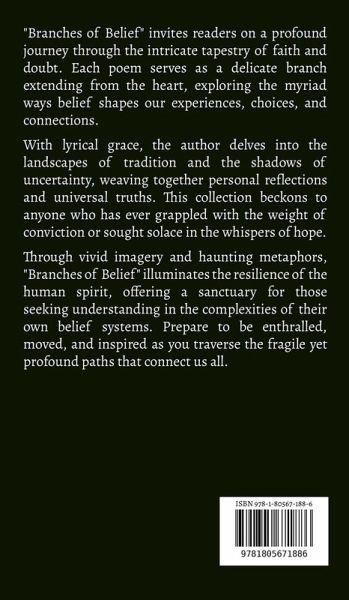 "Branches of Belief" invites readers on a profound journey through the intricate tapestry of faith and doubt. Each poem serves as a delicate branch extending from the heart, exploring the myriad ways belief shapes our experiences, choices, and connections. With lyrical grace, the author delves into the landscapes of tradition and the shadows of uncertainty, weaving together personal reflections and universal truths. This collection beckons to anyone who has ever grappled with the weight of conviction or sought solace in the whispers of hope. Through vivid imagery and haunting metaphors, "Branches of Belief" illuminates the resilience of the human spirit, offering a sanctuary for those seeking understanding in the complexities of their own belief systems. Prepare to be enthralled, moved, and inspired as you traverse the fragile yet profound paths that connect us all.
