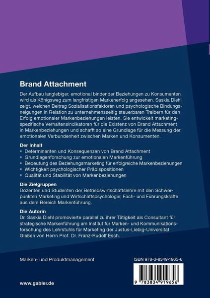Geleitwort Die Etablierung erfolgreicher Markenbeziehungen gewinnt an Bedeutung. Durch die Strahlkraft der Marke möchte man Kunden langfristig an diese binden. Die Qualität solcher Beziehungen kann allerdings stark variieren. So kann man Bindungen durch Wechs- barrieren erzeugen, die vernunftgetrieben sind und zur Gebundenheit führen. Aus der Zufriedenheit mit einer Marke kann man zudem aus Überzeugung eine Verbundenheit mit einer Marke empfinden. Schließlich kann man auch eine emotionale Bindung zur Marke aufbauen, die zu einem so genannten "Brand Attachment" führt. Das Brand Attachment kennzeichnet die affektive und kognitive Verbundenheit mit einer Marke und äußert sich in Verhaltensweisen, die die Beziehungen zu Marken aufrechterhalten. So wichtig dieses Konstrukt für das Marketing ist, weil es billiger ist, vorhandene Kunden zu bearbeiten als neue zu gewinnen, und das Brand Attachment die Marke auch vor selbst verursachten Fehlern und Angriffen von Wettbewerbern schützen kann, so unklar sind hingegen die Indikatoren für Brand Attachment und die Wirkungen des Brand Attachment. Zudem wurden meist nur psychologische Ansätze in das Marketing transferiert, statt einen systematischen Prozess zur Operationalisierung des Brand Attachment auf Basis psyc- logischer Theorien anzustreben. Genau hier setzt die Arbeit von Frau Diehl an, die ausgehend von den psychologischen Theorien deren systematischen Transfer auf die Markenführung analysiert. Folgt man der klassischen Bindungstheorie von Bowlby, so werden bereits in der Kindheit bestimmte Bindungsstile erworben, die als "Trait" auch die Bindung an Marken beeinflussen müssten.