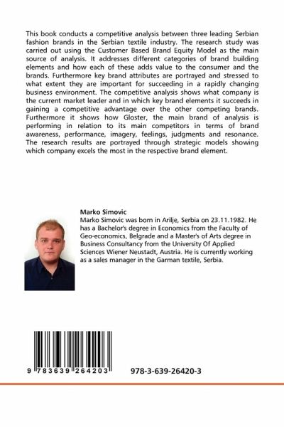 This book conducts a competitive analysis between three leading Serbian fashion brands in the Serbian textile industry. The research study was carried out using the Customer Based Brand Equity Model as the main source of analysis. It addresses different categories of brand building elements and how each of these adds value to the consumer and the brands. Furthermore key brand attributes are portrayed and stressed to what extent they are important for succeeding in a rapidly changing business environment. The competitive analysis shows what company is the current market leader and in which key brand elements it succeeds in gaining a competitive advantage over the other competing brands. Furthermore it shows how Gloster, the main brand of analysis is performing in relation to its main competitors in terms of brand awareness, performance, imagery, feelings, judgments and resonance. The research results are portrayed through strategic models showing which company excels the most in the respective brand element.