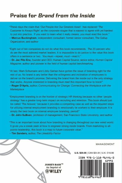 Praise for "Brand from the Inside" "These days the claim that 'Our People Are Our Greatest Asset' has replaced 'The Customer Is Always Right' as the corporate slogan that is easiest to agree with yet hardest to put into practice. If you want to learn what it really means, you must read this book." --Marcus Buckingham, independent consultant; former senior consultant, The Gallup Organization; and author "Eight out of ten companies do not do what this book recommends. The 20 percent who do are the most admired market leaders. It is impossible to do justice to the value this book offers in a sentence or two. You must--repeat, must--read it." --Dr. Jac Fitz-Enz, founder and CEO, Human Capital Source; senior editor, Human Capital Magazine; author and pioneer in the field of human capital benchmarking "At last, Mark Schumann and Libby Sartain have gotten the issue of branding right for the rest of us. No brand is any better than the willingness and inclination of employees to deliver on the brand's promise. Delivering the brand from the inside out is the only strategy that works. Anyone interested in branding must read this important how-to book!" --Roger D'Aprix, author, "Communicating for Change: Connecting the Workplace with the Marketplace" "Employment branding is on the frontier of strategic HR thinking because no other 'people strategy' has a greater long-term impact on recruiting and retention. This book should just be called 'The Answer, ' because it provides a compelling case as well as the required steps for utilizing internal employment branding to emotionally tie workers to their employer. It is simply the best book on internal employee branding, period!" --Dr. John Sullivan, professor of management, San Francisco State University; and author "This is an important book about how branding is changing throughout our new wired world. It gives you a sneak peek at how to engineer strong inside brands. From marketing to all-points-leadership, this book is a map to future corporate value." --Tim Sanders, author, "The Likeability Factor"
