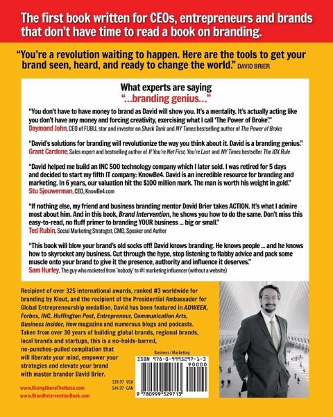 Brand Intervention, 33 Steps to Transform The Brand You Have into the Brand You Need, is the first book written for CEOs, entrepreneurs, brands, and startups that don’t have time to read a book on branding. You and your brand are a revolution waiting to happen. This book was written to provide the tools to get your brand seen, heard, and ready to change the world written and designed by award-winning brand expert and rebranding specialist David Brier, the recipient of over 325 international awards and ranked #3 worldwide for branding by Klout. Are you: -Sick and tired of 300 page business and marketing books with 8 pages of useful content and 290 pages of regurgitation? -Fed up after hearing an amazing TED Talk, purchase that speaker's book only to find nothing more in the book than what they admired in that 18-minute TED Talk? This is why David wrote and designed this book. It doesn’t read like any other book. It’s faster. Inside, it doesn’t look like any other book on branding. It’s shows instead of tells. It is full-color throughout, with 290 pages of straight talk on marketing and branding for real. You find out what triggers sales, turning buyers into loyal fans. Taken from over 30 years of building global brands, regional brands, local brands and startups, this is a no-holds-barred, no-punches-pulled, fat-free compilation of master brander David Brier’s gems. This may explain why Daymond John, New York Times bestselling author of The Power of Broke, FUBU founder and star of ABC’s Shark Tank, wrote the Foreword to this new book and why New York Times bestselling author of The 10X Rule and sales expert Grant Cardone calls Brier "a branding genius" (both Daymond and Grant are Amazon bestsellers in their own right). -If you want proven strategies that took decades to perfect… -If you want to cut through the noise… -If you want branding strategies that have outlasted shifting technologies and new social media channels… …give your brands the power of Brand Intervention. David and his work have been featured in ADWEEK, Forbes, INC, Huffington Post, Entrepreneur, Thrive Global, Communication Arts, How magazine, the New York Times and numerous blogs and podcasts. David is also the recipient of the Presidential Ambassador for Global Entrepreneurship medallion, a rare honor amongst business leaders, presented to those who provide insights to entrepreneurs and startups for leadership, marketing, entrepreneurial innovation, and branding excellence. Find out more about David Brier here. Find out more about this revolutionary book here.