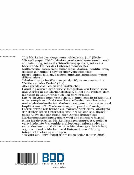 "Die Marke ist das Megathema schlechthin [...]" (Esch/Wicke/Rempel, 2005). Marken gewinnen heute zunehmend an Bedeutung; sei es als Orientierungspunkte, sei es als bedeutende Treiber des Unternehmenswertes.Mittlerweile lassen sich immer mehr Marken identifizieren, die sich zunehmend sowohl über verschiedenste Erlebnisdimensionen als auch ethische, moralische Werte differenzieren."Marken treten im Wettbewerb der Werte an - anstatt im Wettbewerb der Preise" (Illy)Aber gerade das Fehlen von praktischen Handlungsvorschlägen für die Integration von Erlebnissen und Werten in die Markenstrategie bildet ein Problem, dem man sich in Zukunft noch stellen wird müssen. Das vorliegende Buch versucht nun einen Schritt in Richtung eines komplexen, funktionsübergreifenden, wertbasierten und erlebnisorientierten Markenmanagements zu setzen und Implikationen für Markenmanager in praxi aufzuzeigen.Hierzu entwickelt Ivancic ein markenorientiertes Paradigma der strategischen Unternehmensführung, den sog. Brand-based View, das den komplexen Anforderungen des Markenmanagements gerecht wird und skizziert folgend einen idealtypischen Markenmanagementprozess, welcher verschiedenste Markenhierarchieebenen miteinander zu verbinden sucht und danach trachtet einer ganzheitlichen, organisationalen Marken- und Unternehmensführung integriert Rechnung zu tragen."Es wird ein Jahrhundert der Marken sein." (Lotter, 2005)