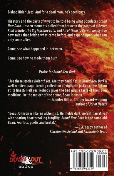 Bishop Rider Lives! And for a dead man, he's been busy. His story and the parts of it yet to be told being what populates Brand New Dark. Unseen moments pulled from between the pages of A Better Kind of Hate, The Big Machine Eats, and All of Them to Burn. Twenty-five new tales that bridge what came before and expand upon what can only come after. Come, see what happened in-between. Come, see how he made them burn. Praise for BRAND NEW DARK: "Beau Johnson masterfully crafts sharp, incisive short fiction, and Bishop Rider is the perfect vehicle for his mix of gallows humor and righteous anger. Brand New Dark is an intoxicating blend of violence and bone-deep humanity that lingers with you long after the final page." -James D.F. Hannah, Shamus Award-winning author of the Henry Malone novels "Brand New Dark is an utterly terrifying, high-octane mix of Lee Child's Jack Reacher and a Nicolas Winding Refn production, powered by a voice that's unique to crime fiction. It's a mega-dose of the darkest in human nature...and murderously inventive." -Nick Kolakowski, author of Rattlesnake Rodeo and Boise Longpig Hunting Club "Do you like stories about bad guys being torn apart in new and ever-innovative ways? Then boy has Beau Johnson got the books for you. But Beau does more than just tell tales of unbridled violence, he delivers them with a wit and humour that keeps you smiling, when really your stomach should be doing flips." -Paul Heatley, author of Cutthroat and Just Like Jesus "Brand New Dark is a powerful mix of vengeance, violence, and razor-sharp writing by one of crime fiction's most daring short story writers." -E.A. Aymar, author of The Unrepentant "Johnson doesn't play nice. When it comes to ultraviolence, he's doing for crime what Barker did for horror. Brand New Dark will slap you in the mouth." -Laird Barron, author of Worse Angels "Dark, bloody, and righteously gruesome, Brand New Dark satisfies the itch for beautifully written crime fiction, where the violence is seen from the corners of our eyes and over our shoulders as Johnson's relentless pacing propels us forward to a fate we can't look away from, no matter the cost." -Laurel Hightower, author of Crossroads "Beau Johnson is like an alchemist. He melds dark violent narratives with searing heartbreaking fragility. Brand New Dark is the same old Beau. Fearless, poetic and brutal." -S.A. Cosby author of Blacktop Wasteland and Razorblade Tears "Are these stories violent? Yes. Are they dark? Yes. Is Brand New Dark a well-written, page-turning collection of vigilante justice crime fiction at its finest? Hell yes. Nobody gives the bad guys a taste of their own medicine like the master of the genre, Beau Johnson." -Jennifer Hillier, Thriller Award-winning author of Jar of Hearts "Johnson never forgets how im