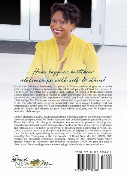 Brand New Me: Complemented, Completed & Whole provides singles and couples with the insight into how to have healthy relationships with self first then others. In this thought-provoking and engaging book, Author, Therapist & Restoration Expert Chautè Thompson challenges readers to apply lessons learned from real life relatable scenarios and personal life experiences, which can break the cycle of unhealthy relationships. Ms. Thompson creates an interactive opportunity for women and men to do the internal work to grow individually and as a couple building healthier relationships. Brand New Me: Complemented, Completed and Whole is your unique guide for singles and couples to grow from within equipping you for happier and healthier relationships. Connect with the author Chautè Thompson at info@chautethompson.com