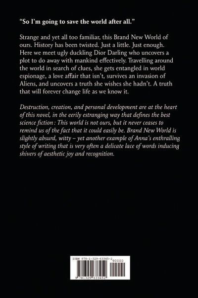 "So I'm going to save the world after all." Strange and yet all too familiar, this Brand New World of ours. History has been twisted. Just a little. Just enough. Here we meet ugly duckling Dior Darling who uncovers a plot to do away with mankind effectively. Travelling around the world in search of clues, she gets entangled in world espionage, a love affair that isn't, survives an invasion of Aliens, and uncovers a truth she wishes she hadn't. A truth that will forever change life as we know it. Destruction, creation, and personal development are at the heart of this novel, in the eerily estranging way that defines the best science fiction¿: This world is not ours, but it never ceases to remind us of the fact that it could easily be. Brand New World is slightly absurd, witty - yet another example of Anna's enthralling style of writing that is very often a delicate lace of words inducing shivers of aesthetic joy and recognition.
