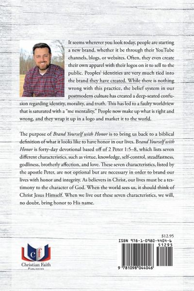 It seems wherever you look today, people are starting a new brand, whether it be through their YouTube channels, blogs, or websites. Often, they even create their own apparel with their logos on it to sell to the public. Peoples' identities are very much tied into the brand they have created. While there is nothing wrong with this practice, the belief system in our postmodern culture has created a deep-seated confusion regarding identity, morality, and truth. This has led to a faulty worldview that is saturated with a "me mentality." People now make up what is right and wrong, and they wrap it up in a logo and market it to the world. The purpose of Brand Yourself with Honor is to bring us back to a biblical definition of what it looks like to have honor in our lives. Brand Yourself with Honor is forty-day devotional based off of 2 Peter 1:5-8, which lists seven different characteristics, such as virtue, knowledge, self-control, steadfastness, godliness, brotherly affection, and love. These seven characteristics, listed by the apostle Peter, are not optional but are necessary in order to brand our lives with honor and integrity. As believers in Christ, our lives must be a testimony to the character of God. When the world sees us, it should think of Christ Jesus Himself. When we live out these seven characteristics, we will, no doubt, bring honor to His name.