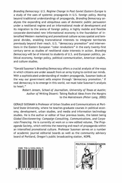 «Gerald Sussman's 'Branding Democracy' offers a crucial analysis of the ways in which citizens are under assault from an army trying to control our minds. With a sophisticated understanding of modern propaganda, Sussman looks at the way our government sells empire through 'democracy promotion'. If real democracy is to emerge in this world, we must take Sussman's analysis to heart.» (Robert Jensen, School of Journalism, University of Texas at Austin; Author of 'Writing Dissent: Taking Radical Ideas from the Margins to the Mainstream' (Peter Lang, 2002))