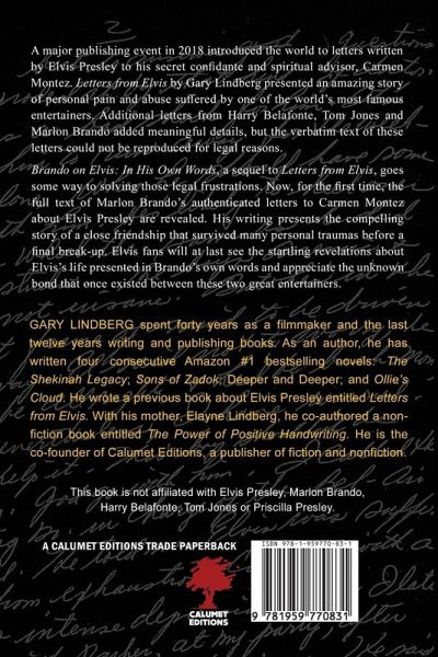 A major publishing event in 2018 introduced the world to letters written by Elvis Presley to his secret confidante and spiritual advisor, Carmen Montez. Letters from Elvis by Gary Lindberg presented an amazing story of personal pain and abuse suffered by one of the world's most famous entertainers. Additional letters from Harry Belafonte, Tom Jones and Marlon Brando added meaningful details, but the verbatim text of these letters could not be reproduced for legal reasons. Marlon On Elvis: In His Own Words, a sequel to Letters from Elvis, goes some way to solving those legal frustrations. Now, for the first time, the full text of Marlon Brando's authenticated letters to Carmen Montez about Elvis Presley are revealed. His writing presents the compelling story of a close friendship that survived many personal traumas before a final break-up. Elvis fans will at last see the startling revelations about Elvis's life presented in Brando's own words and appreciate the unknown bond that once existed between these two great entertainers.