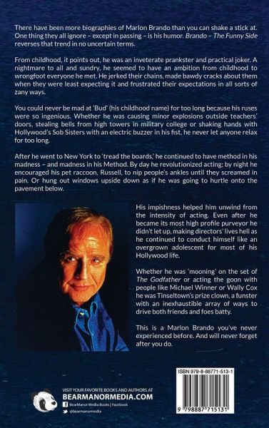 There have been more biographies of Marlon Brando than you can shake a stick at. One thing they all ignore - except in passing - is his humor. Brando - The Funny Side reverses that trend in no uncertain terms. From childhood, it points out, he was an inveterate prankster and practical joker. A nightmare to all and sundry, he seemed to have an ambition from childhood to wrongfoot everyone he met. He jerked their chains, made bawdy cracks about them when they were least expecting it and frustrated their expectations in all sorts of zany ways. You could never be mad at 'Bud' (his childhood name) for too long because his ruses were so ingenious. Whether he was causing minor explosions outside teachers' doors, stealing bells from high towers in military college or shaking hands with Hollywood's Sob Sisters with an electric buzzer in his fist, he never let anyone relax for too long. After he went to New York to 'tread the boards,' he continued to have method in his madness - and madness in his Method. By day he revolutionized acting; by night he encouraged his pet raccoon, Russell, to nip people's ankles until they screamed in pain. Or hung out windows upside down as if he was going to hurtle onto the pavement below. His impishness helped him unwind from the intensity of acting. Even after he became its most high profile purveyor he didn't let up, making directors' lives hell as he continued to conduct himself like an overgrown adolescent for most of his Hollywood life. Whether he was 'mooning' on the set of The Godfather or acting the goon with people like Michael Winner or Wally Cox he was Tinseltown's prize clown, a funster with an inexhaustible array of ways to drive both friends and foes batty. This is a Marlon Brando you've never experienced before. And will never forget after you do.