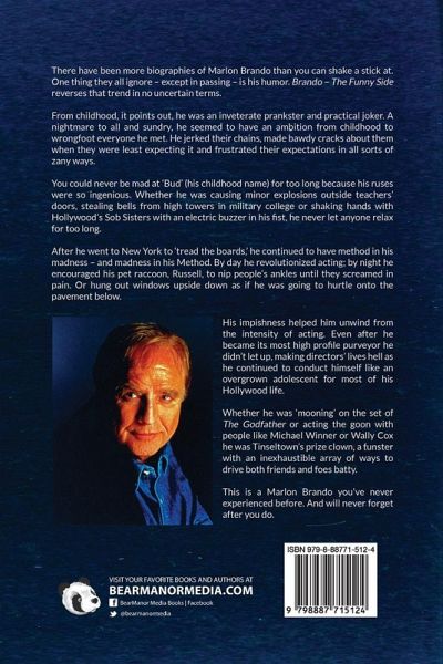 There have been more biographies of Marlon Brando than you can shake a stick at. One thing they all ignore - except in passing - is his humor. Brando - The Funny Side reverses that trend in no uncertain terms. From childhood, it points out, he was an inveterate prankster and practical joker. A nightmare to all and sundry, he seemed to have an ambition from childhood to wrongfoot everyone he met. He jerked their chains, made bawdy cracks about them when they were least expecting it and frustrated their expectations in all sorts of zany ways. You could never be mad at 'Bud' (his childhood name) for too long because his ruses were so ingenious. Whether he was causing minor explosions outside teachers' doors, stealing bells from high towers in military college or shaking hands with Hollywood's Sob Sisters with an electric buzzer in his fist, he never let anyone relax for too long. After he went to New York to 'tread the boards,' he continued to have method in his madness - and madness in his Method. By day he revolutionized acting; by night he encouraged his pet raccoon, Russell, to nip people's ankles until they screamed in pain. Or hung out windows upside down as if he was going to hurtle onto the pavement below. His impishness helped him unwind from the intensity of acting. Even after he became its most high profile purveyor he didn't let up, making directors' lives hell as he continued to conduct himself like an overgrown adolescent for most of his Hollywood life. Whether he was 'mooning' on the set of The Godfather or acting the goon with people like Michael Winner or Wally Cox he was Tinseltown's prize clown, a funster with an inexhaustible array of ways to drive both friends and foes batty. This is a Marlon Brando you've never experienced before. And will never forget after you do.