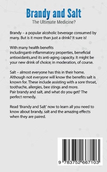 Brandy and SaltThe Ultimate Medicine?Brandy - a popular alcoholic beverage consumed by many. But is it more than just a drink? It sure is!With many health benefits including anti-inflammatory properties, beneficial antioxidants, and its anti-aging capacity. It might be your new drink of choice; in moderation, of course.Salt - almost everyone has this in their home. Although not everyone will know the benefits salt is known for. These include assisting with a sore throat, toothache, allergies, bee stings and more.Pair brandy and salt, and what do you get? The perfect remedy.Read 'Brandy and Salt' now to learn all you need to know about brandy, salt and the amazing effects when they are paired.