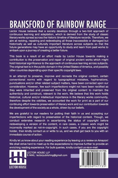 NEW PRINT WITH PROFESSIONAL TYPE-SET IN CONTRAST TO SCANNED PRINTS OFFERED BY OTHERS Bransford Of Rainbow Range: Originally Published Under The Title Of Bransford Inarcadia Or, The Little Eohippus This book is a result of an effort made by us towards making a contribution to the preservation and repair of original classic literature. In an attempt to preserve, improve and recreate the original content, we have worked towards: 1. Type-setting & Reformatting: The complete work has been re-designed via professional layout, formatting and type-setting tools to re-create the same edition with rich typography, graphics, high quality images, and table elements, giving our readers the feel of holding a 'fresh and newly' reprinted and/or revised edition, as opposed to other scanned & printed (Optical Character Recognition - OCR) reproductions. 2. Correction of imperfections: As the work was re-created from the scratch, therefore, it was vetted to rectify certain conventional norms with regard to typographical mistakes, hyphenations, punctuations, blurred images, missing content/pages, and/or other related subject matters, upon our consideration. Every attempt was made to rectify the imperfections related to omitted constructs in the original edition via other references. However, a few of such imperfections which could not be rectified due to intentional\unintentional omission of content in the original edition, were inherited and preserved from the original work to maintain the authenticity and construct, relevant to the work. We believe that this work holds historical, cultural and/or intellectual importance in the literary works community, therefore despite the oddities, we accounted the work for print as a part of our continuing effort towards preservation of literary work and our contribution towards the development of the society as a whole, driven by our beliefs. We are grateful to our readers for putting their faith in us and accepting our imperfections with regard to preservation of the historical content. HAPPY READING!