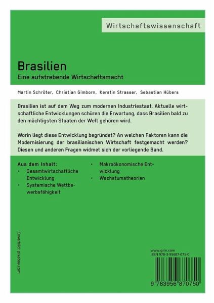 Fachbuch aus dem Jahr 2013 im Fachbereich VWL - Fallstudien, Länderstudien, , Sprache: Deutsch, Abstract: Brasilien ist auf dem Weg zum modernen Industriestaat. Aktuelle wirtschaftliche Entwicklungen schüren die Erwartung, dass Brasilien bald zu der mächtigsten Staaten der Welt gehören wird.Worin liegt diese Entwicklung begründet? An welchen Faktoren kann die Modernisierung der brasilianischen Wirtschaft festgemacht werden? Diesen und anderen Fragen widmet sich der vorliegende Band.Aus dem Inhalt: Gesamtwirtschaftliche Entwicklung, Systemische Wettbewerbsfähigkeit, Makroökonomische Entwicklung, Wachstumstheorien.