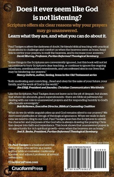 Does it ever seem like God is not listening? Scripture offers six clear reasons why your prayers may go unanswered. Learn what they are, and what you can do about it. -------------------------------- Sometimes we're tempted to wonder if God can hear us. After months or even years of praying over a particular person or situation, we look for evidence that God is getting our message or even paying attention, and we can't find much. Why is that? Why do the heavens sometimes seem as hard and reflective as brass? Doesn't God love us and care for us? Isn't he all-powerful? What's going on? In "Brass Heavens" author, pastor, and biblical counselor Paul Tautges grounds prayer in the character of our Triune God whose very nature is to share generously his good gifts with his children. Upon that foundation, he then explores six reasons why at times God appears to go silent. As we examine these causes of unanswered prayer, we discover the biblical means by which we may open God's ears to our voice once again. God has a good and holy purpose for periods of silence. He wants to test our faith that we might see for ourselves just how weak and dependent we are on him for all good things. His goal is nothing less than to heighten our spiritual sensitivities in order to draw us into more intimate fellowship with him and more faithful obedience to him.