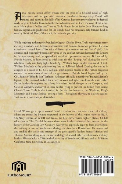 A true history lesson deftly woven into the plot of a fictional novel of high adventure and intrigue with romantic interludes Teenage Gray Cloud, well trained and adept in the skills of his Catawba hunter/warrior relatives, is deemed ready to go to Charles Town to further his education and to learn the ways of the white man. He is given a "white man's" name, Truly Doran, by his father Sean Doran - long hunter, trapper, and guide/scout for the British. Sean has amassed a tidy fortune, held in trust by his friend, Henry Siles, a ship factor in the port city. While studying at the newly founded college at Charles Town, Truly experiences many exciting situations and becomes acquainted with famous historical persons. He also experiences several love affairs with different girls (strumpets and "nice" girls). He observes and eventually becomes involved in the conflict between hardscrabble farmers in the up-country and the spoiled scions of rich plantation owners. Befriended by Francis Marion, he later serves as chief scout for the "Swamp Fox" during the war of rebellion. Early on, Truly fights beside Sgt. William Jasper under command of Col. William Moultrie at the palmetto-log fort on Sullivan's Island. During the war he is assigned as a scout to Lt. Col. William Washington's cavalry as the Patriot dragoons counter the murderous thrusts of the green-coated British Loyal Legion led by Lt. Col. Banister "Bloody Ban" Tarleton. Although officially a member of Francis Marion's legion, Truly is often detached for service as scout and fighter in skirmishes with other Patriot leaders throughout the colony. He assists Daniel Morgan at the Cowpens, and Gates at Camden, and served in three battles trying to prevent the British from taking Charles Town. Truly is also involved in the decisive battles at the Waxhaws, King's Mountain and Eutaw Springs, among others. Throughout the war, he is active against Tarleton in a dozen major skirmishes.