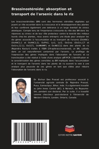 Les brassinostéroïdes (BR) sont des hormones stéroïdes végétales qui jouent un rôle essentiel dans la croissance et le développement des plantes et leur confèrent également une tolérance à un large éventail de stress abiotiques. Compte tenu de l'importance croissante du rôle des BR dans les réponses au stress et de leur rôle protecteur contre la toxicité des métaux lourds chez les plantes, nous avons entrepris une étude pour analyser les dix gènes associés à l'accumulation et au transport de l'arsenic [OsHACs (OsHAC1;1 et OsHAC1;2), OsPht1, Lsi1, Lsi2, OsGrxs (OsGrx_C7 et OsGrx_C2.1), OsCLT1, OsNRAMP1 et OsABCC1] dans des plants de riz (Rajendra Kasturi) traités à l'EBR (24-epibrassinosteroid), un BR, cultivés dans un sol naturellement contaminé par l'arsenic. Le profilage de l'expression des gènes impliqués dans l'absorption de l'arsenic et sa translocation a été réalisé à l'aide d'une analyse qRT-PCR. L'identification et la caractérisation des gènes sensibles au BR impliqués dans l'accumulation et le transport de l'arsenic dans les plants de riz ouvrent la voie à une analyse plus poussée de ces gènes en tant que cibles pour réduire l'absorption de l'arsenic dans le riz.