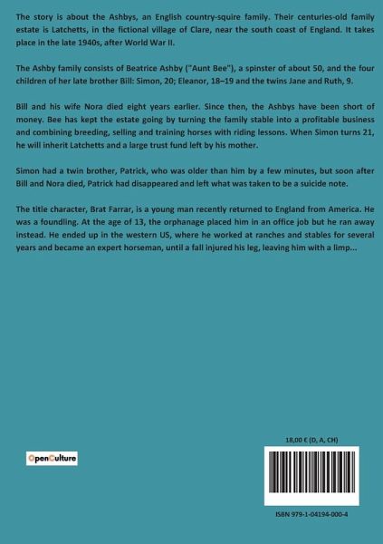 The story is about the Ashbys, an English country-squire family. Their centuries-old family estate is Latchetts, in the fictional village of Clare, near the south coast of England. It takes place in the late 1940s, after World War II. The Ashby family consists of Beatrice Ashby ("Aunt Bee"), a spinster of about 50, and the four children of her late brother Bill: Simon, 20; Eleanor, 18¿19 and the twins Jane and Ruth, 9. Bill and his wife Nora died eight years earlier. Since then, the Ashbys have been short of money. Bee has kept the estate going by turning the family stable into a profitable business and combining breeding, selling and training horses with riding lessons. When Simon turns 21, he will inherit Latchetts and a large trust fund left by his mother. Simon had a twin brother, Patrick, who was older than him by a few minutes, but soon after Bill and Nora died, Patrick had disappeared and left what was taken to be a suicide note. The title character, Brat Farrar, is a young man recently returned to England from America. He was a foundling. At the age of 13, the orphanage placed him in an office job but he ran away instead. He ended up in the western US, where he worked at ranches and stables for several years and became an expert horseman, until a fall injured his leg, leaving him with a limp...