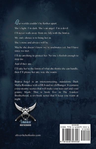 Our worlds couldn't be further apart... She's light. I'm dark. She's an angel. I'm a devil. I'll never walk away from my life with the bratva. My only choice is to bring her in. She's mine and always will be. Maybe she doesn't know we're soulmates yet, but I have since we met. I'll do anything to protect her. No one's foolish enough to stop me. And if they are... I'll take her to the limits of what she thinks she can handle, then I'll please her any way she wants. Bratva Angel is an interconnecting, standalone Dark Mafia Romance with a HEA and no cliffhanger. It contains extra-steamy scenes that will make your toes curl and your granny blush. This is book five in The Ivankov Brotherhood, a six-book series that'll keep you warm at night.