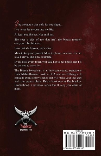 She thought it was only for one night... I've never let anyone into my life. At least not like her. Not until her. She sees a side of me that isn't the bratva monster everyone else believes. Now that she knows, she's mine. Mine to keep and protect. Mine to please. In return, it's her love I crave. She's my soulmate. Every kiss, every touch will take her to her limits, and I'll be the one to catch her. The Bratva Sweetheart is an interconnecting, standalone Dark Mafia Romance with a HEA and no cliffhanger. It contains extra-steamy scenes that will make your toes curl and your granny blush. This is book two in The Ivankov Brotherhood, a six-book series that'll keep you warm at night.