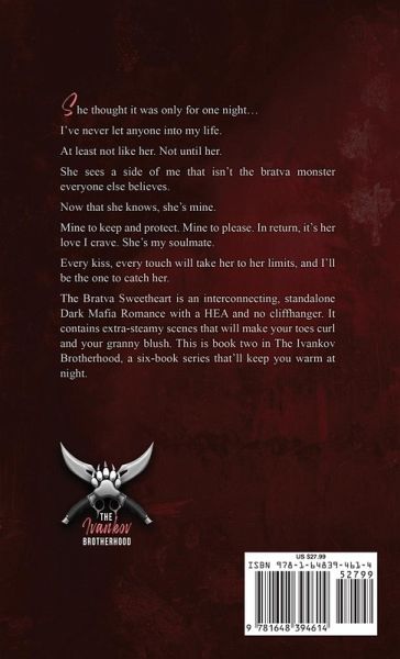 She thought it was only for one night... I've never let anyone into my life. At least not like her. Not until her. She sees a side of me that isn't the bratva monster everyone else believes. Now that she knows, she's mine. Mine to keep and protect. Mine to please. In return, it's her love I crave. She's my soulmate. Every kiss, every touch will take her to her limits, and I'll be the one to catch her. The Bratva Sweetheart is an interconnecting, standalone Dark Mafia Romance with a HEA and no cliffhanger. It contains extra-steamy scenes that will make your toes curl and your granny blush. This is book two in The Ivankov Brotherhood, a six-book series that'll keep you warm at night.