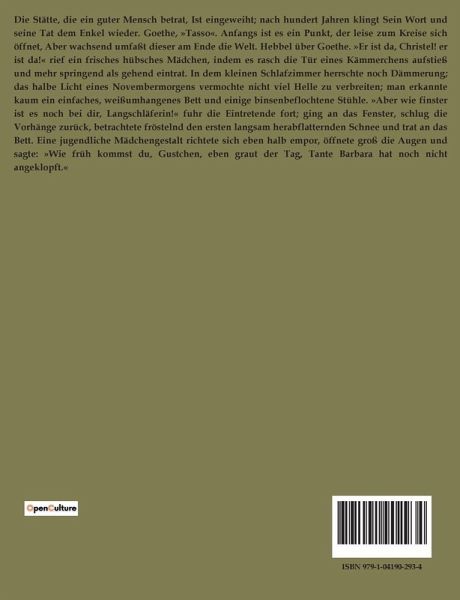 Die Stätte, die ein guter Mensch betrat, Ist eingeweiht; nach hundert Jahren klingt Sein Wort und seine Tat dem Enkel wieder. Goethe, »Tasso«. Anfangs ist es ein Punkt, der leise zum Kreise sich öffnet, Aber wachsend umfaßt dieser am Ende die Welt. Hebbel über Goethe. »Er ist da, Christel! er ist da!« rief ein frisches hübsches Mädchen, indem es rasch die Tür eines Kämmerchens aufstieß und mehr springend als gehend eintrat. In dem kleinen Schlafzimmer herrschte noch Dämmerung; das halbe Licht eines Novembermorgens vermochte nicht viel Helle zu verbreiten; man erkannte kaum ein einfaches, weißumhangenes Bett und einige binsenbeflochtene Stühle. »Aber wie finster ist es noch bei dir, Langschläferin!« fuhr die Eintretende fort; ging an das Fenster, schlug die Vorhänge zurück, betrachtete fröstelnd den ersten langsam herabflatternden Schnee und trat an das Bett. Eine jugendliche Mädchengestalt richtete sich eben halb empor, öffnete groß die Augen und sagte: »Wie früh kommst du, Gustchen, eben graut der Tag, Tante Barbara hat noch nicht angeklopft.«