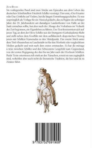 Im vorliegenden Band sind zwei Stücke um Episoden aus dem Leben des deutschen Schriftstellers Friedrich Schiller vereinigt. Das erste, »Der Knaster oder Das Göttliche auf Erden«, hat die längste Entstehungsgeschichte. Es war ursprünglich als Vorlage für ein Musical gedacht, das zu Beginn der achtziger Jahre des 20. Jahrhunderts am damaligen Landestheater von Halle an der Saale entstehen sollte, hat aber nach der Absage des Vorhabens im Verlaufe der Zeit begonnen, ein Eigenleben zu führen. Der Text konzentriert sich auf jenen Tag, an dem der Eleve Schiller aus der Stuttgarter Karlsakademie flieht und stellt neben dem Konflikt mit dem aufklärerisch despotischen Herzog jenen mit Schillers Kameraden in den Mittelpunkt. Das zweite Stück unter dem Titel »Brautschau zu Lauchstädt« ist für den Hörfunk oder vergleichbare Medien gedacht und weit nach dem ersten entstanden. Es hat die ménage à trois zwischen Schiller und den Schwestern Lengefeld zum Gegenstand, von der ersten Begegnung der drei bis ins Jahr nach der Hochzeit Schillers. Beide Texte orientieren sich stark an den Tatsachen, soweit sie uns zugänglich sind, verhehlen aber auch nicht die literarische Tradition, die hier und da zu Zitaten führt.