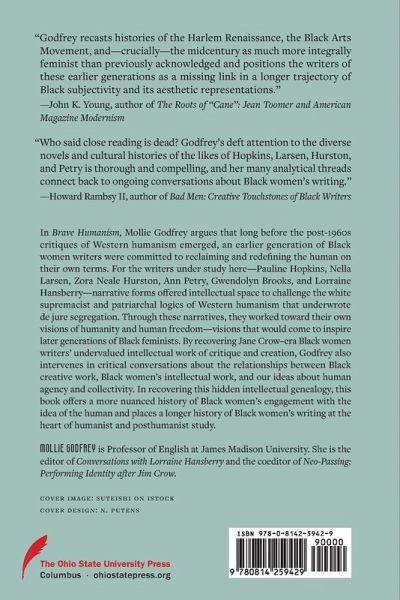 In Brave Humanism, Mollie Godfrey argues that long before the post-1960s critiques of Western humanism emerged, an earlier generation of Black women writers were committed to reclaiming and redefining the human on their own terms. For the writers under study here-Pauline Hopkins, Nella Larsen, Zora Neale Hurston, Ann Petry, Gwendolyn Brooks, and Lorraine Hansberry-narrative forms offered intellectual space to challenge the white supremacist and patriarchal logics of Western humanism that underwrote de jure segregation. Through these narratives, they worked toward their own visions of humanity and human freedom-visions that would come to inspire later generations of Black feminists. By recovering Jane Crow-era Black women writers' undervalued intellectual work of critique and creation, Godfrey also intervenes in critical conversations about the relationships between Black creative work, Black women's intellectual work, and our ideas about human agency and collectivity. In recovering this hidden intellectual genealogy, this book offers a more nuanced history of Black women's engagement with the idea of the human and places a longer history of Black women's writing at the heart of humanist and posthumanist study.