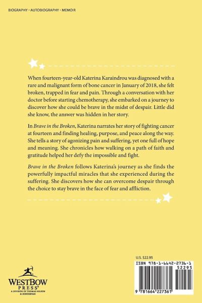 When fourteen-year-old Katerina Karaindrou was diagnosed with a rare and malignant form of bone cancer in January of 2018, she felt broken, trapped in fear and pain. Through a conversation with her doctor before starting chemotherapy, she embarked on a journey to discover how she could be brave in the midst of despair. Little did she know, the answer was hidden in her story. In Brave in the Broken, Katerina narrates her story of fighting cancer at fourteen and finding healing, purpose, and peace along the way. She tells a story of agonizing pain and suffering, yet one full of hope and meaning. She chronicles how walking on a path of faith and gratitude helped her defy the impossible and fight. Brave in the Broken follows Katerina's journey as she finds the powerfully impactful miracles that she experienced during the suffering. She discovers how she can overcome despair through the choice to stay brave in the face of fear and affliction.